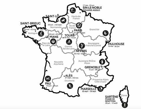 Cette aventure artistique iéndite est à découvrir de mai à novembre prochain, dans les villes de Douaisis, Grenoble, Le Mans, Marseille, Mulhouse, Nevers, Paris, Pau, Saint-Brieuc, Saint-Lô, Sartène, Tours et Alès.