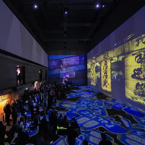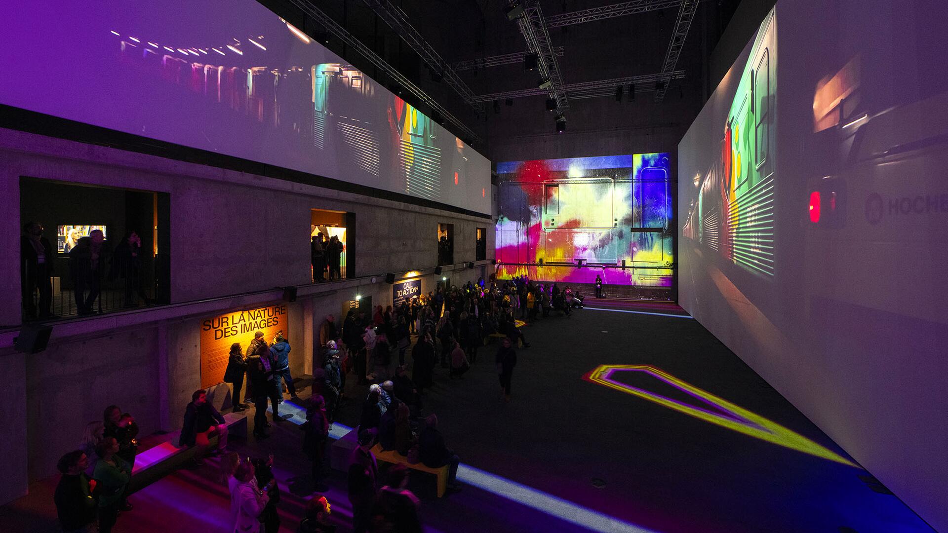 ambiance mêlant musique, projections monumentales et dispositifs interactifs.