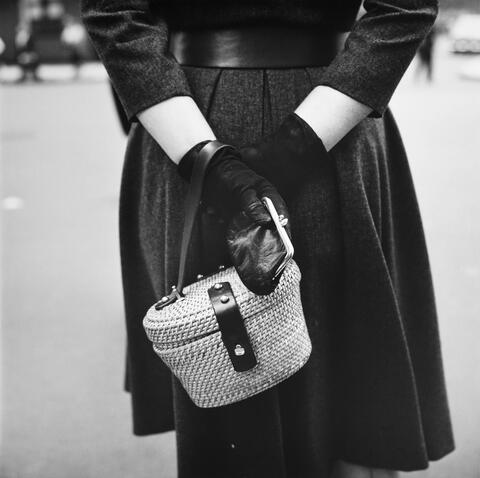 Une sévère robe-manteau d’après-midi, à manches trois-quarts et taille soulignée par une large ceinture. Vivian Maier se concentre sur le petit sac en paille tressée, qui contraste avec l’austérité de la tenue. Il est très à la mode.