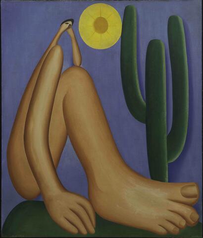 Tarsila puise également son inspiration dans les récits fantastiques du Brésil. Dans le tableau A Cuca, elle représente une étrange créature jaune, inspirée d’une sorcière à tête d’alligator, figure terrifiante des contes pour enfants. Mais ce n’est pas tout : certains voient aussi dans le personnage de Abaporu une référence au Saci Pererê, un diablotin légendaire à un seul pied, espiègle et malicieux. Ces personnages issus des mythes populaires brésiliens, accompagnés de formes audacieuses et de couleurs vives, révèlent l’univers onirique et réinventé de Tarsila.