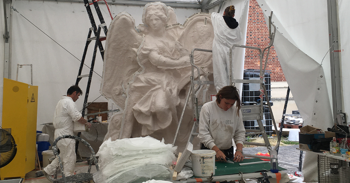 Le mois dernier vous avez pu découvrir le début du chantier du moulage de l'imposante sculpture La Renommée du Roi, au Château de Versailles, par les experts mouleurs-statutaires